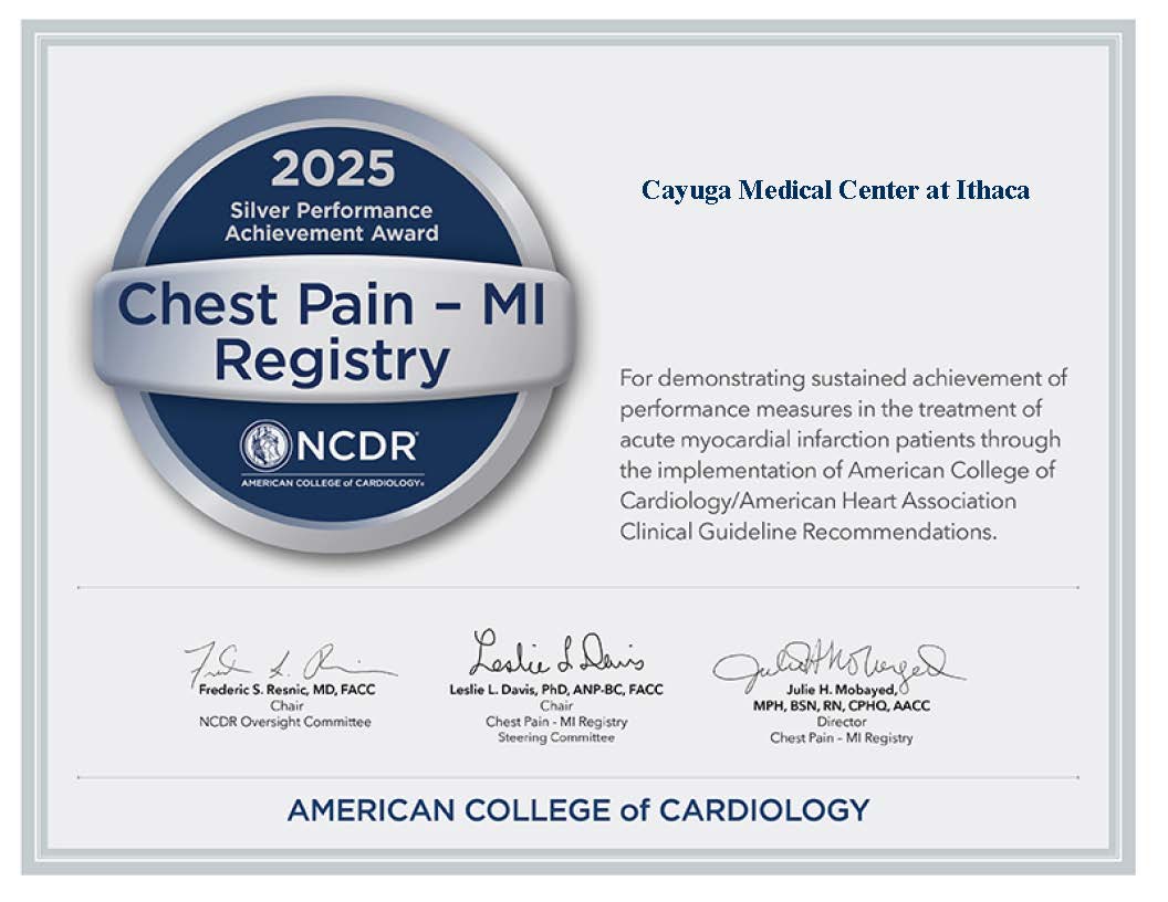 The Cayuga Heart and Vascular Center is a hospital-wide multidisciplinary team of health professionals linking Admissions, the Emergency Department, the Cardiac Catheterization Team, Intensive Cardiac Care Unit, Inpatient Telemetry, Outpatient Testing, the Laboratory, Imaging Services, Nutrition and Dining, the Cayuga Center for Healthy Living, Cardiovascular Rehabilitation, and our Emergency Medical Services (EMS) providers. Working together, we provide a comprehensive network of cardiac care.
