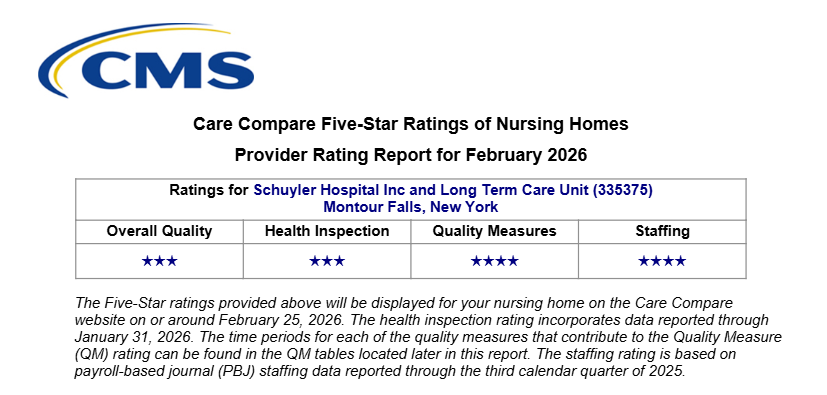 Adjacent to Schuyler Hospital, Seneca View residents have access to the full range of hospital services, such as the Emergency Department and pain clinic.